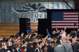 USA. Rindge, NH. 2016. The crowd swarms Bernie Sanders after...