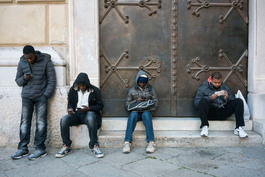 ITALY. Sicily. Palermo. African immigrants with their smartphones,...
