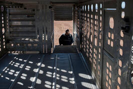 USA. Douglas, AZ. 2016. Trucks approach the corrals to wait for...
