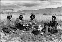 TIBET. 2000. Old woman boiling tea at harvest-time.