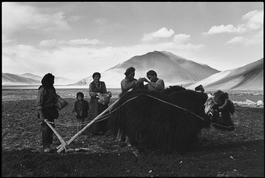 TIBET. 2004. Mother and daughter adding sheep manure to fire....