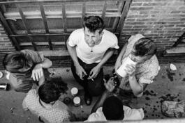 USA. New York City. 1959. Ray BREMSER on the fire escape of Allen...
