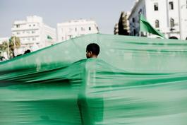 LIBYA. Zawiyah. 2011. Green and white pro-Qaddafi banners cover...