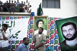 LIBYA. Zawiyah. 2011. A Qaddafi supporter holds a portrait of...