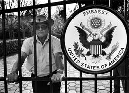NICARAGUA. Managua. 1984. A guard stands inside the U.S. Embassy...