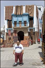 TUNISIA, Kairouan. Street scene with carpet seller.
