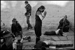 CHINA. Tibet. Lhasa. A Buddhist pilgrim performs the ritual of...