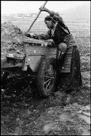 TIBET. 2003. Young woman unloading fertilizer.