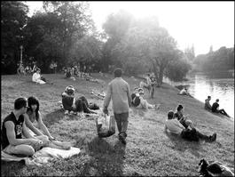 People relaxing on the shores of the “Urbahnhafen” in Berlin....