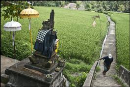 INDONESIA. BALI. Ubud. Rice field with an altar dedicated to...
