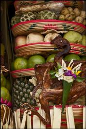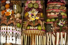 INDONESIA. BALI. Gianyar. Offerings of fruits, cakes and roasted...