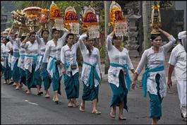 INDONESIA. BALI. Gianyar. A procession of women take offerings...