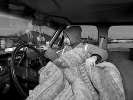 USA. Williston, ND. 2012. Dog inside dirty truck. Outside Hampton...