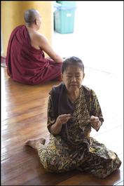 INDONESIA. BALI. Gianyar. A woman worships in a Hindu temple....
