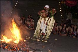 INDONESIA. BALI. Ubud. A villager executes a fire dance, mounted...