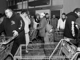 USA. Williston, ND. 2012. Customers waiting for Walmart to open...