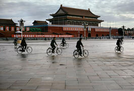 Peking. Children welcome a politician on Tien An Men Avenue.