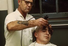 USA. Parris Island, South Carolina. 1970. A recruit has his hair...