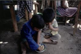 Aguacantenango. Two of Victoria's grandchildren eat off the floor...
