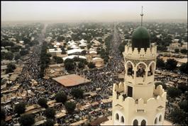 SENEGAL. Crowds of pilgrims pack the streets below a minaret...