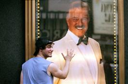 USA. New York City. 2002. Times Square. A jester outside a store...
