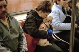 USA. New York City. 2002. Times Square. A lady and her pet on...