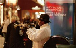 USA. New York City. 2002. Times Square. A trumpeter plays for...