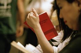 USA. New York City. 2002. Times Square. A young lady reads her...