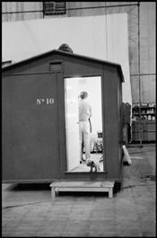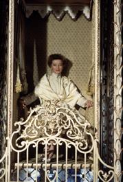 1959. Katharine HEPBURN looks out from her trailer on the set...