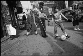 USA. New York City. 2002. Nina playing soccer on Norstrand Avenue...