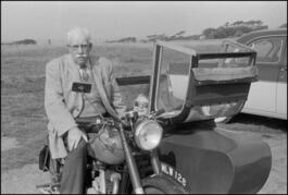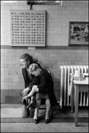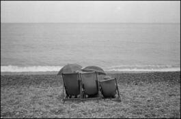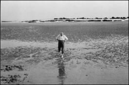 ENGLAND. Brighton. 1960. Woman in black on stone beach.
