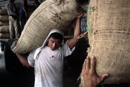 ECUADOR. Near Duran. 2002. Workers carry bags of cacao beans...