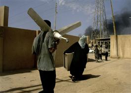 IRAQ. Baghdad. People burning and throwing stones at a poster...