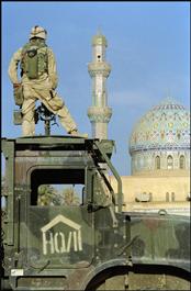 IRAQ. Baghdad. Armed US Marine in front of a mosque. 2003.