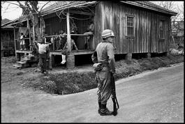 USA. Alabama. 1965. A National Guardsman stands outside a black...
