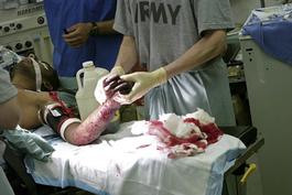 IRAQ. Taji Airbase, Baghdad. January 2005. Medic taking a shrapnel...