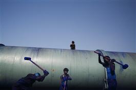 INDIA. Mumbai. 2006. At a barrel recycling business, workers...