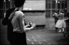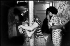 USA. Brooklyn, NY. 1957. Couple necking on pole at basement party...