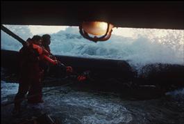 Abeille Flandre. Captain Claden and crew check a safety beacon,...