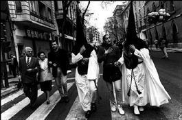 SPAIN. Sevilla. 1996. Holy week. Hooded Nazarenos and non penitent...