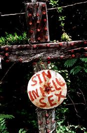 USA. Illinois. Chicago. 1996. Cross covered with sin confessions...