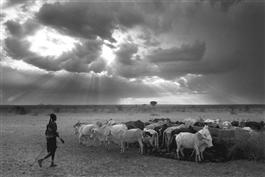 Tanzania. Dorobo tribe. A Masai member herds cattle on the Masai...