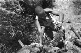 Tanzania. Dorobo tribe. A hunter climbs towards an active hive....