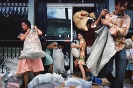 NICARAGUA. Esteli. 1979. Townspeople taking goods from burned-out...