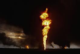 KUWAIT. Burgan oil fields. Oil tanks set ablaze by Iraqi invaders...