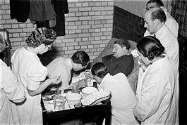 First aid room in underground shelter during the Blitz. casualties...