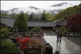 KOREA. Tongdosa Buddhist Temple. Devotees pray by walking around...