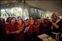INDIA. Buddha Hall of Osho ashram in Poona, spiritual singing...