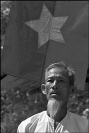 Vietnamese farmer standing in front of the Vietcong flag in a...