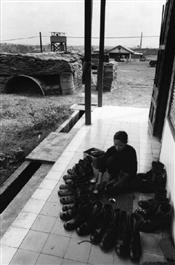 Kontum. U.S. airbase. Vietnamese woman shining the shoes of the...